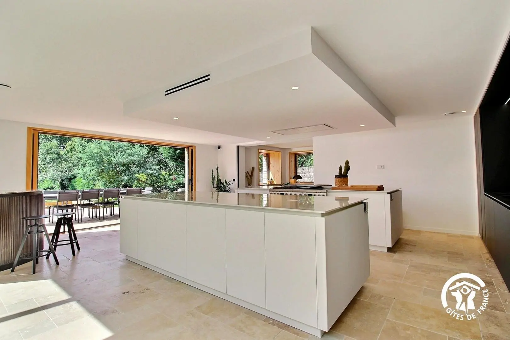 Véritable pièce centrale de la villa, la cuisine ouverte s’intègre naturellement à la grande pièce de vie et à la terrasse.