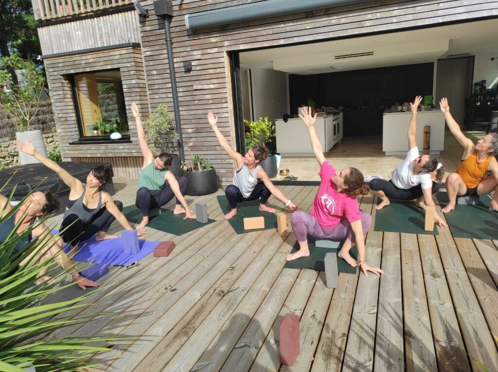 Sur la vaste terrasse en bois, face au jardin arboré, les séances se déroulent au rythme du souffle et du chant des oiseaux.